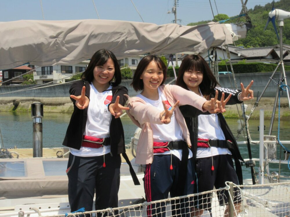 The next morning several students and some of their teachers already waited at the pier. We took our students on board: Nanaho, Mai and Ayidi, all in the 2nd year of their IT studies. We sailed with them out into the bay for two hours, explained the boat, had a picnic on deck and took lots of pictures, being also the object of an official photo shooting for the town’s newspaper and news channel.  Our three students enjoyed it very much, and so did we.