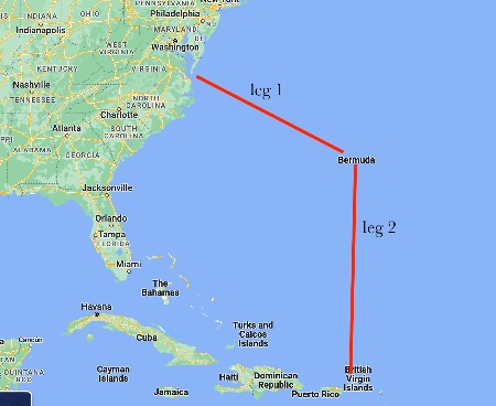 One big reason we’re not opting for the Bahamas this time around is the sheer challenge of getting east from there. The journey from the Bahamas to the Eastern Caribbean is sometimes called the “Thorny Path” – the prevailing winds are easterly, meaning you’re trying to go in the very same direction the wind is blowing from. While it’s possible to do it in hops from island to island, those hops are frequently difficult and any progress hard fought. If you’re not comfortable with multi-day ocean passages, the idea of most nights being safely anchored somewhere can be very reassuring. Because to go direct to the Caribbean from the US East coast is a 1300 mile trip, give or take a hundred miles or so. On Calypso, we’re expecting it to be between 10 and 16 days, maybe longer.