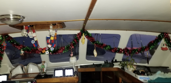 With the tide we flew through Hell Gate and down the East River in the late afternoon. Once in the lower harbor we set just the small staysail and raced down the New Jersey shore at seven knots with the hydrovane steering and the pilot house decorated for Christmas!