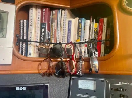 Pro Tip. Use a bungee across your bookshelf in the nav station or in front of any other shelf, and use it to hold glasses. Reading glasses, sunglasses and whatever glasses you use daily will be accessible, safe, and stay in place. This was a huge breakthrough for us as my husband was always looking for his glasses as he put them in different places around the boat. One bungee, every time, for all glasses, will make your life easier.
