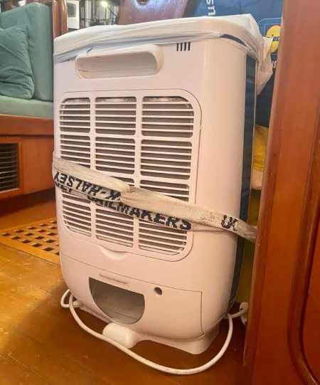 Every time we enter a marina and have access to shore power, we start up Junior. We tried the small dehumidifiers with the discs that pull the water out of the air. They are messy, need to be replaced often and didn’t make a dent in our humidity. Junior sucks a gallon of water out of the air, out of your closets and clothes, in 24 hours.