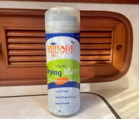 Unfortunately, I went on Amazon and searched for Mirage Drying Mate. I don’t think it exists anymore. The previous owners must have bought it a decade ago before they moved on board. The closest thing I could find to it is the ShamWow towel. I believe it will provide the same service. I would recommend finding a sealable plastic canister to store the towel in if it doesn’t come with one. The towel works best when it’s slightly damp. This is one of those items that you don’t need that often, but when you do, you are very grateful to have it.