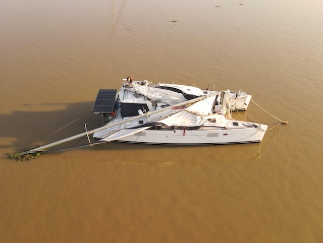 Dismasted and a dirty river. Image courtesy Catamaran Javerne.