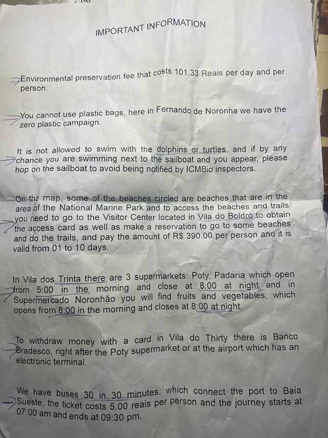 Marco speaks no English and we speak no Portuguese, but with the help of google translate, we were able to get by. He also had a pre-typed English language information page that he handed to us to explain the rules and expectations and provide information around the area. He called the Federal Police to come to the office to meet us and examine the passports and stamp us into the country. The Police took our passports to their office and returned them to Marco for us to pick up later in the day. He called the Navy to complete the vessel entrance formalities, which was just a page to be completed. There is no Customs clearance on the island, and if one wishes to continue on within Brazil, they must clear in (with Customs) at their next port on the mainland. For us, the total clearance process took less than an hour, with time spent sharing a fine coffee with Marco.