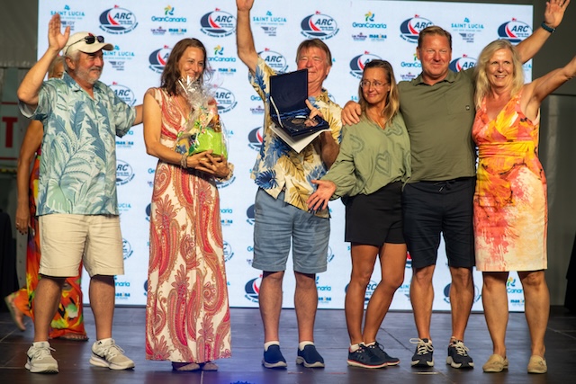 Everyone’s Atlantic experience is unique. The Kaprys Award for overcoming adversity was awarded to Tradewind 35 Cara of the South (IRL). Sailing double-handed, skipper Gary O’Grady and crew David Cant suffered multiple system failures, but their ingenuity and dogged determination kept them on course, crossing the line after 24 days at sea. The sextant workshop in Las Palmas with astro-nav guru Stokey Woodall giving Gary the confidence to navigate safely to Saint Lucia mainly by sextant. This is Gary’s second double-handed ARC, having crossed in 2022 in the 8.7m Westerly Konsort Katy (GBR).