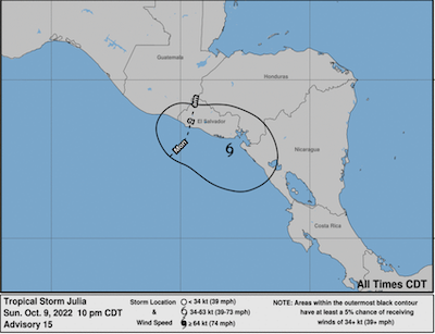 As it moved north along the coasts of Honduras, El Salvador and Guatemala Julia was downgraded to a Tropical Storm but the NHC maintains a warning of “the risk of life-threatening flash floods and mudslides across Central America and Southern Mexico” through Tuesday October 11.