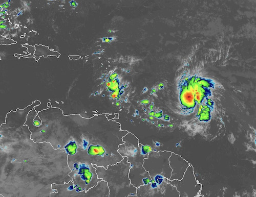 A tropical storm warning is in effect Wednesday for St. Lucia and Martinique, meaning tropical storm conditions are possible within 36 hours. Tropical storm watches are in effect for Barbados and Dominica, meaning tropical storm conditions are possible there within 48 hours.