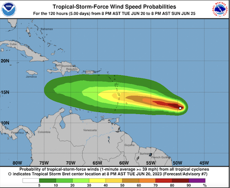 “Little change in strength is forecast during the next day or so while Bret approaches the Lesser Antilles,” the National Hurricane Center said in an evening advisory. “Weakening is anticipated to begin Thursday night or Friday after Bret passes the Lesser Antilles, and the system is likely to dissipate over the central Caribbean Sea by Saturday.”