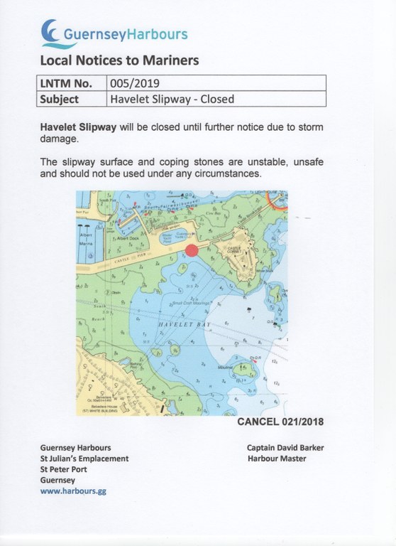 The storm damage to the slipway normally used by crews when landing from their dinghy, is now unsafe and cannot be used in any circumstances. This will cause difficulties for boats which use this anchorage as an alternative to entering the adjacent harbor of St Peter Port. The only alternative method of landing is to scale the vertical iron ladder on the wall by the castle.
