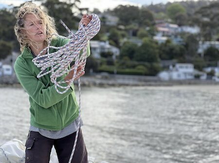 Kirsten Neuschäfer, of Port Elizabeth, South Africa, receives the Blue Water Medal for 2023 in recognition of the tremendous effort, determination, and skill she exhibited during her 235-day solo circumnavigation in Minnehaha, her Cape George 36 sailboat.