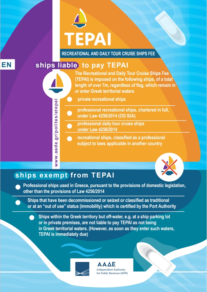 This is the Greek cruising tax payable by all vessels over 7m and MUST be applied for online prior to arrival. Cruisers are still reporting having issues with payment and we’ve included some useful links at https://www.noonsite.com/place/greece/view/documents/ to help with this. However, it does not appear to be a problem paying for the E-Tepai on arrival and no yachts have reported being penalised for this.