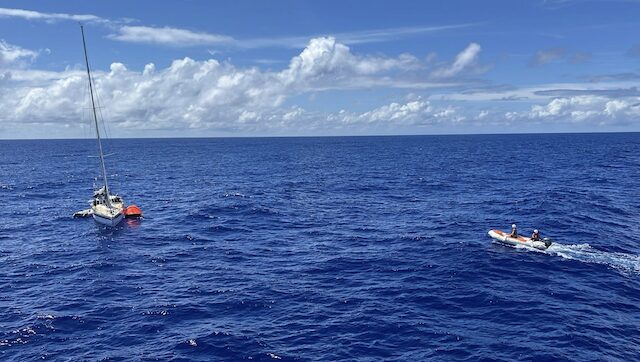 On Friday 15 August at 07:50, JRCC Tahiti received a distress call from the Swedish flagged sailboat Itornia which had apparently begun taking on water after a collision with an unidentified floating object. The distress beacon made it possible to locate the ship and its two occupants at 55 nautical miles west of Mopelia, in the archipelago of the Society Islands.
