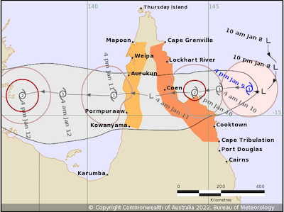 Gale force winds with gusts to 110 km/h are expected to develop between Cape Tribulation and Coen including Cooktown early Monday January 10 as Tiffany approaches the coast. Destructive wind gusts to 130 km/h are possible near the system centre on Monday as it approaches the coast. Gales may extend north to Cape Grenville including Lockhart River later on Monday. Heavy rain is expected to accompany the system as it moves across Cape York Peninsula.