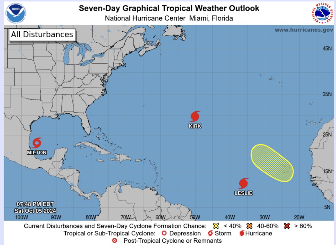 The National Hurricane Center is also watching a tropical wave that is expected to move off the west coast of Africa in a few days. The NHC says some development of this system is possible thereafter while it moves westward or west-northwestward across the eastern tropical Atlantic. The system is expected to move near or over the Cabo Verde Islands on Wednesday October 9 and Thursday October 10.