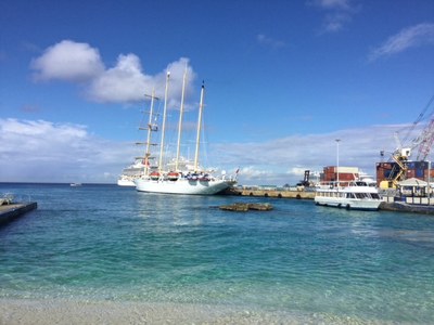 A Harbour Patrol boat will meet and escort you to the Customs dock to complete customs and immigration formalities. (see photo below courtesy of Brian Simm). It is possible to request permission to check in from a mooring, rather than go alongside the dock, due to a nearby coral head which is above water. Cruisers have reported being offered a lift to shore by the authorities.