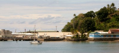 The blue building in the right of the photo is the town diesel generator (which is very noisy) and the buildings to the left are the tuna cannery which can generate a strong fishy smell at times.