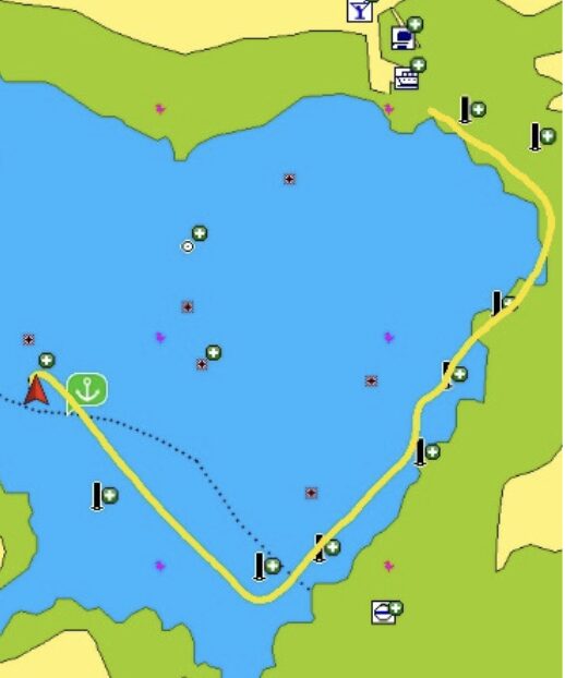 Cruisers report the charted port and starboard buoys are in place but the yellow buoy near the entrance is not in place. Also deeper water than charted. If taking your dinghy to drop people at the pier, DO NOT cross the anchorage as it is full of rocks. Instead, go right around the outside as shown in this pic from SV Hawkeye.
