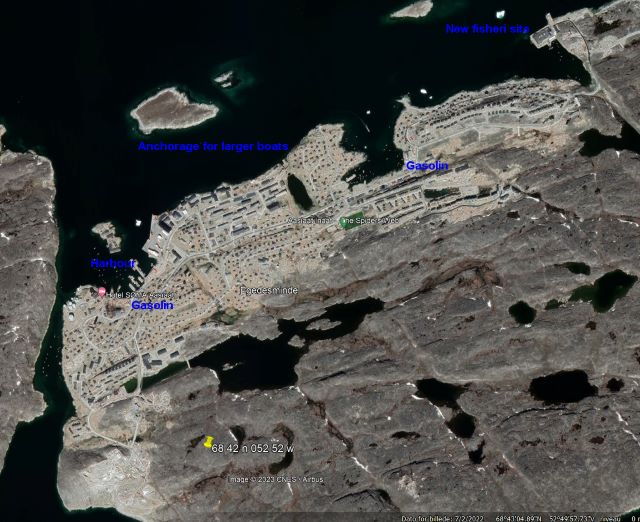There are two public pontoons where a dinghy can be left when you go ashore. Two pontoons normally are used for refueling - one in the harbour and one in the western fjord 'Tipitoq' (again see photos).