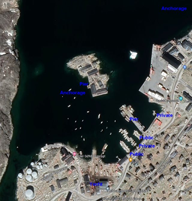 See these useful photo diagrams showing the anchorages and facilities in the harbor (provided by Bo Mogensen).