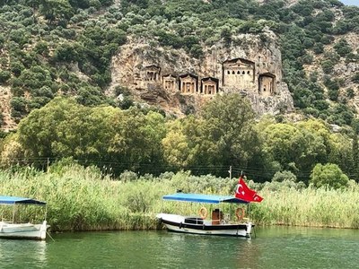 The water here is turquoise in color, there are some very nice walks both hill climbing or on the flat around the bay. We took a private boat taxi to take us up through the shallow delta to the town of Dalyan, one is taken through miles of high growing reeds to reach the deeper water of the Dalyan river were we stopped for a long riverside lunch washed down with a few bottles of excellent local wine, then we were off to view the ancient Carian rock tombs which are simply fantastic works of art.