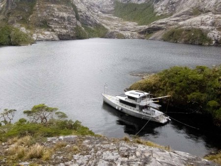 While Jim was running to shore in the dinghy to set up the first, and most important shoreline, we were dropping our big 150 Kg Manson anchor and backing down toward shore against the wind as we let out chain, all while watching our scanning sonar for obstacles. By the time we had 60 meters out in 15 meters of water, Jim had tied off the first shoreline and run back to the boat. Once cleated off, we were secure, so the pace was more leisurely as we set the second shoreline at a 30 degree angle to the first.