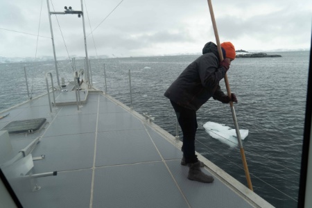Our skills at dealing with ice-filled anchorages improved with experience and time. We used our small 5G radar to set up guard zones and track the larger bergs. We learned to use the engines and bow thruster to dodge and push away ice whilst at anchor. Our daughter, Kim, became the resident expert with the ice poles. Our dinghies became tugs to lasso and drag or push remarkably large bergs away. We also found that our floating poly lines could be strung across bays between us and the glaciers (they all had glaciers except Deception which made up for it with high winds and poor holding in volcanic ash) to keep the ice at bay. If the winds and tide were right, the ice would accumulate on the line and then drift off on the change of tide leaving us unscathed. When it was safe to do so, we would raft together and share ice watches so that both crews could get more rest.