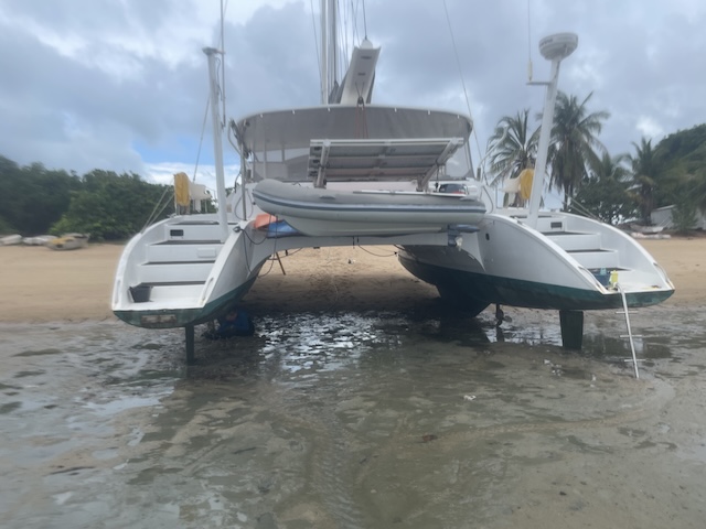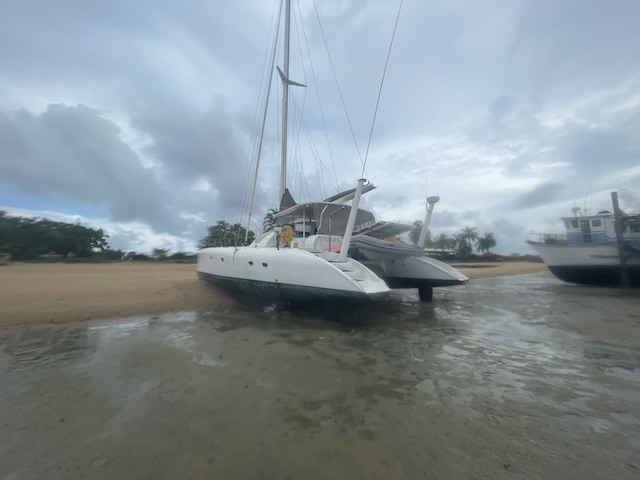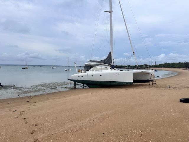 Beached at Gove. On the right are the poles for steadying monohulls. (c) Dominique Cabarroque SV Manuka.