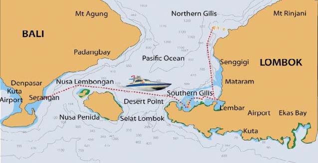 Then cross leaving the most Northern tip of Nusa Lemboggan to starboard about 300 meters to sea from the reef line. Check my waypoint 08.39.175S 115.26.770E on your charts and ensure it makes sense, if it does, set your course.