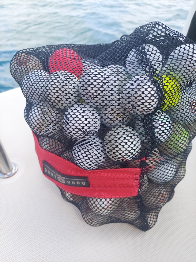 Karen shows off the haul of golf balls collected from underwater reefs off Curacao in the Caribbean. (c) Karen Erens – SV Blowing Bubbles.