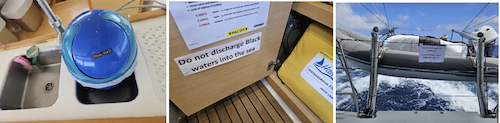 L to R Rubbish Only, Do Not Discharge Black Waters into the Sea and Do not Throw Garbage overboard.