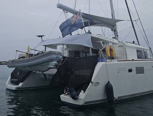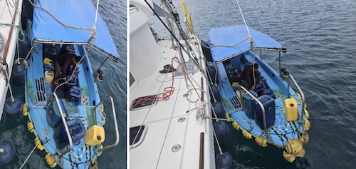 Put all your fenders down on your starboard side (as this is most likely to face the town dock) and only board through your starboard boarding gate. Don’t try and board at your stern as the 30’ long water taxi (and imagine the weight with all those people on board!) will simply smash up your stern. We also put two ropes out by the boarding gate so that when the ferry arrives they pull themselves alongside using those ropes rather than trying to pull on our stanchions or fenders. You need to put these fenders out the moment you are anchored in case a boat with officials turns up!