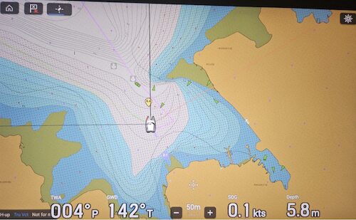 Our track is in purple (zoomed out so the red and green buoys near the entrance aren’t shown) on the following screenshot from our chart plotter: