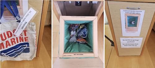L to R – Recyclables, Non-Recyclables and Do Not Throw Garbage Overboard/Do not Discharge Black Water into the Sea