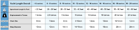 Trying a few different sources is a good idea to see what other opinions there are and what they are based on, but you can get a good idea of what you will need from this chart – check the most appropriate column for your yacht and then overlay your anchoring reliance to make your decision.
