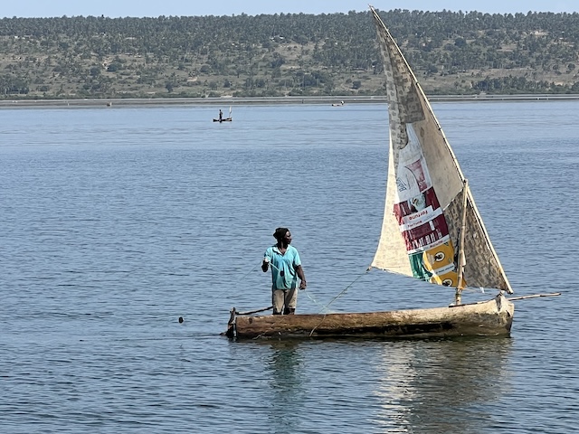 The locals of Mozambique and Madagascar are impressive sailors.  Sails are made from any fabric they can find – we even saw one with a shirt stitched into it.  This boat is a dug out canoe with a hand made sail allowing this local to sail effortlessly around the bay.  Nothing short of impressive. (c) Brent Crack.