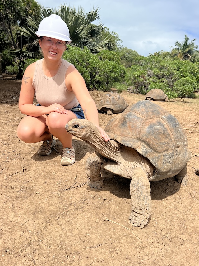 Mary with a Reunion Island local. The hard hat was for a cave tour. (c) Brent Crack.