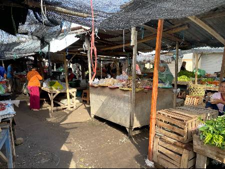Farmers market every morning in Tanjung, which is 2-3 km from the marina on the left side of the road.  There is also a small supermarket in Tanjung: Berlian Raya on the left side of the road.