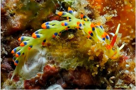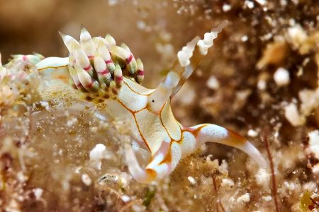 Lynette adds: “Nudibranchs have all those wonderful colors as a way of warning predators that they are poisonous. They absorb toxins from the coral and other forms of life that they eat, which has allowed them to get rid of their shells.”