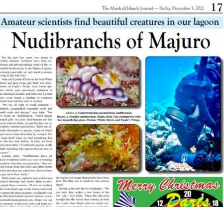 Both teams use sophisticated underwater camera housings and strobe lights to photograph these creatures. ( Visit the Marshall Islands Journal website, to see pictures in glorious color and high-resolution). “You can’t really appreciate these beautiful creatures in a black-and-white newspaper photograph!” says Lynette.