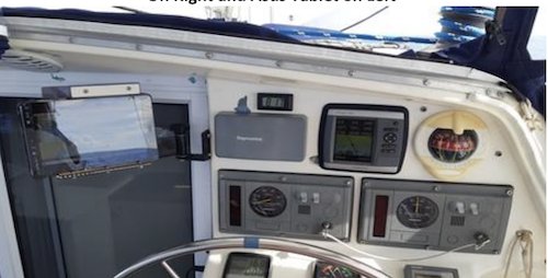 Soggy Paws Helm Station with Garmin 526S chart plotter on right and Asus Tablet on left.