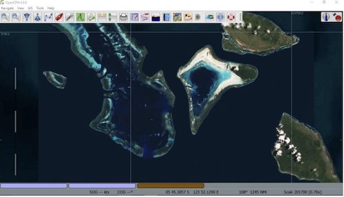 Recognizing this, much work has already been done by the overseas cruising community, at least in the Pacific and Indian Oceans. The major players we are aware of are all SSCA members. Many of us out here have been using satellite imagery for our close-in navigation charting with OpenCPN for at least 10 years. The advantages of doing this over using even up-to-date commercial charting are many, including little expense, greatly improved accuracy and shoreline detail, and the ability to trade imagery, waypoints and tracks with other OpenCPN users.