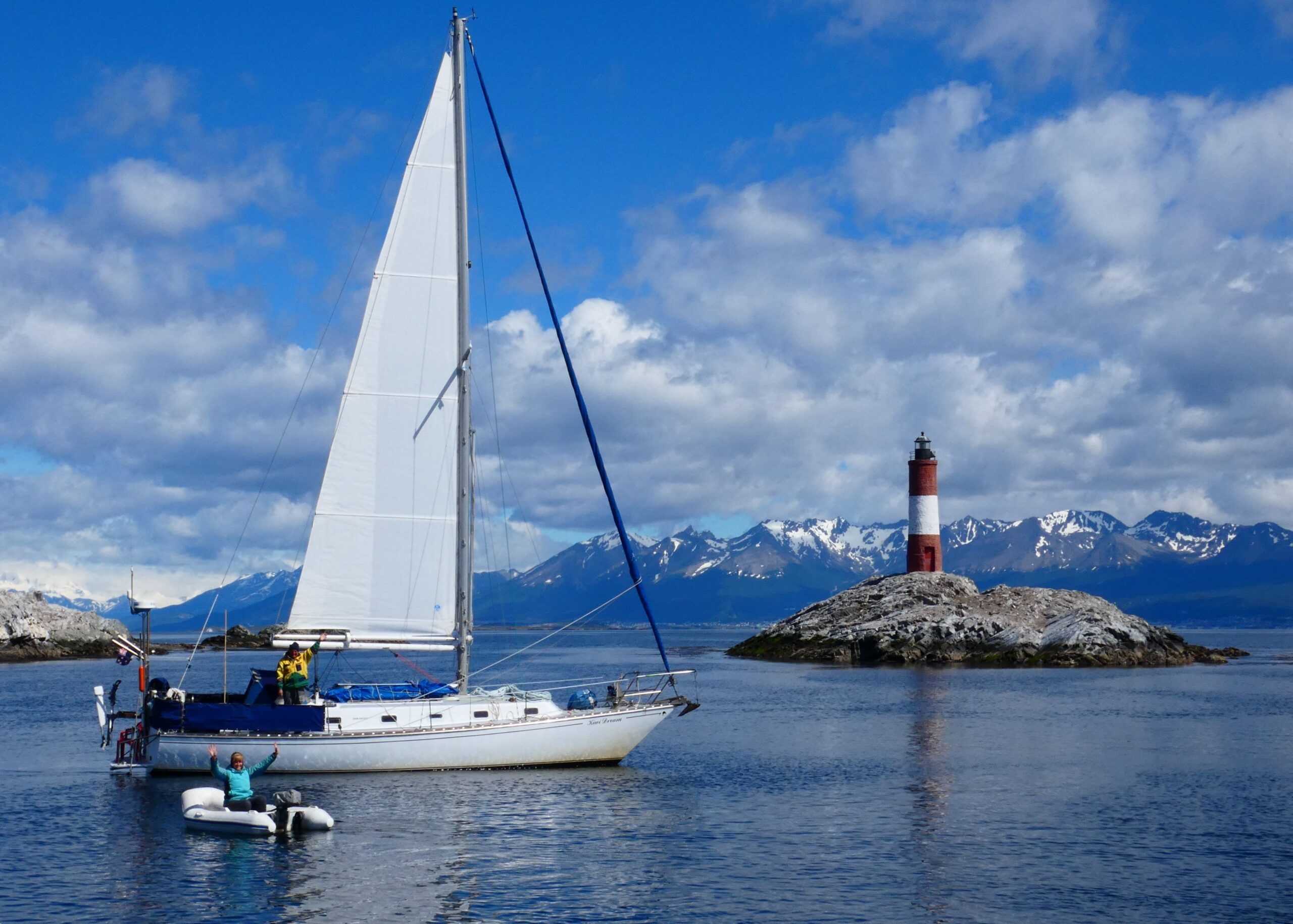 The weather was good and we were off, sailing ‘Round the Horn’. In reality this involved circumnavigating the island, not a TRUE rounding from west to east or east to west. The weather was perfect and I got into the dinghy with its 2 horse power outboard “Pam” and took photos from the Drake Passage, of Kiwi Dream sailing in front of Cape Horn!