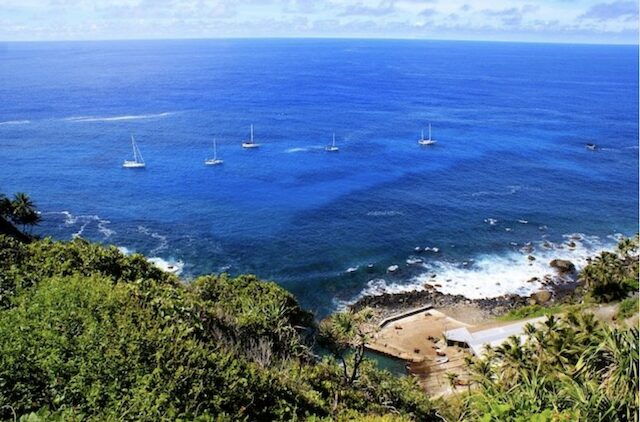 Bounty Bay is available as an anchorage in a smaller range of conditions than the anchorage at Western Harbour. Western Harbour also has far less coral to contend with, with good holding in sand in about 16-18m. But it should be stressed again that both are barely protected, conditions are always uncomfortable due not only to incoming swell but also ‘rebound’ waves off the island. At one point we pitched high enough that we got air up the cutlass bearing…