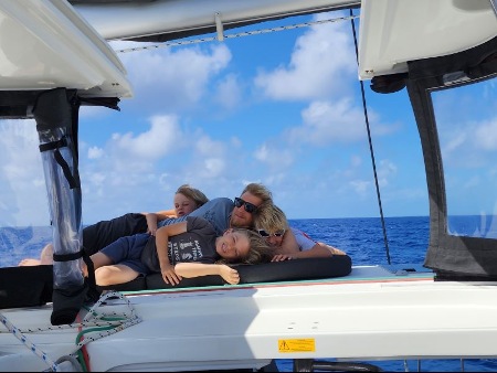 We like to sit on the coach roof cushions or the trampoline while we are sailing.