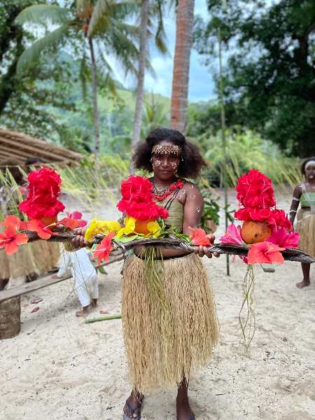 The chief of the village, John Ruka, is almost obsessed by yachts! He welcomed us with a flower display that was better than anything in a florist shop back home. On our last night he prepared a mini festival for the three of us, with welcome drinks, a meal on flower plates and Kastom dancing by a fire. It was all very special and a lot of laughs. John can arrange food, dancing, BBQs, tracking or be a guide for a tour of the island, villages or even further afield.