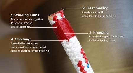 Stitching and whipping the end of a rope binds all the separate strands, plaits and layers (inner and outer braids) together in their designed configuration, guaranteeing consistency of the rope construction.
