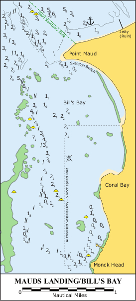 There are no jetties or marinas along the Ningaloo coast. There are a total of just five public moorings: three at Tantabiddi in the north, and two at Mauds Landing in the south.