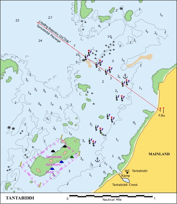 The reef lies one to three miles offshore and the swell breaks on it heavily. The coast and off-lying reef is hazardous and requires careful pilotage. The reef is steep-to on its west side, rising without warning from relatively deep water and can remain unseen until close by. Even today, some charting packages do not show the reefs correctly and more than one yacht has hit a reef as a result of relying solely on one source of information. Always work with at least two independent sources of pilotage information and use your eyes.