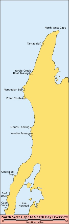 Facilities? Not many. Yachts should be self-sufficient in all respects until they reach either Exmouth (population 3,000) in the north, or Carnarvon (population 5,500) in the south. The distance from Exmouth to Carnarvon is 370 kms (230 miles). A few of the anchorages have camping sites with toilets and rubbish bins, Fresh water is scarce.